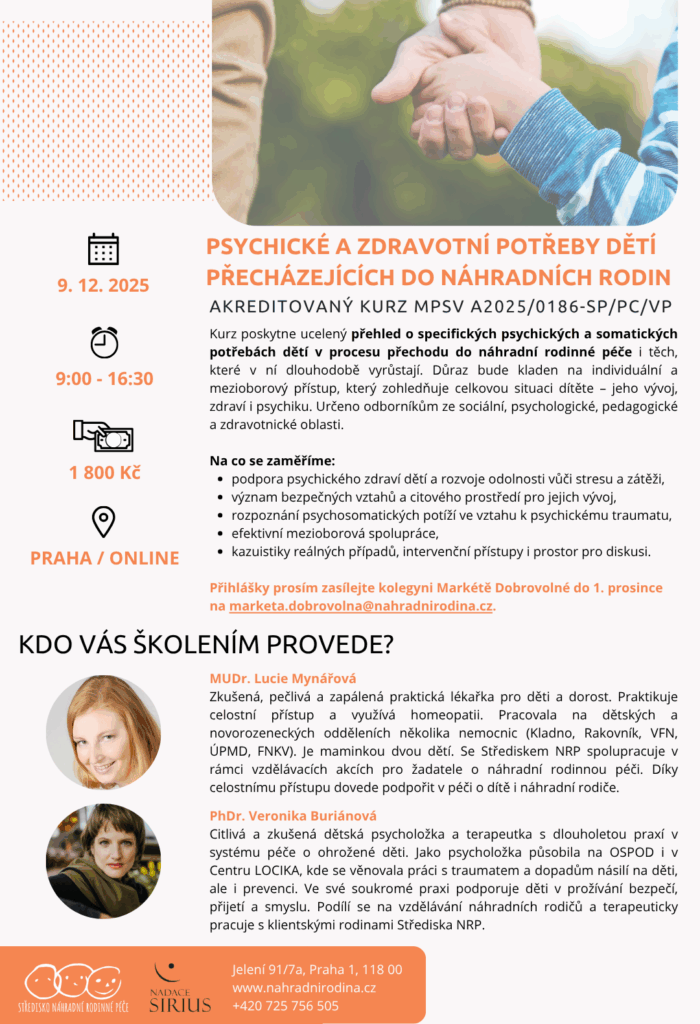 Kurz poskytne ucelený přehled o specifických psychických a somatických potřebách dětí v procesu přechodu do náhradní rodinné péče i těch, které v ní dlouhodobě vyrůstají. Důraz bude kladen na individuální a mezioborový přístup, který zohledňuje celkovou situaci dítěte – jeho vývoj, zdraví i psychiku. Určeno odborníkům ze sociální, psychologické, pedagogické a zdravotnické oblasti.