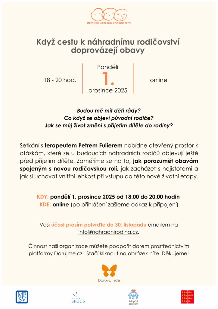 Setkání s terapeutem Petrem Fulierem nabídne otevřený prostor k otázkám, které se u budoucích náhradních rodičů objevují ještě před přijetím dítěte. Zaměříme se na to, jak porozumět obavám spojeným s novou rodičovskou rolí, jak zacházet s nejistotami a jak si uchovat vnitřní lehkost při vstupu do této nové životní etapy.