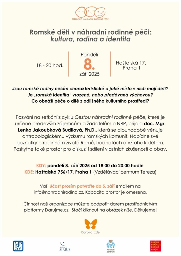 Pozvání na setkání z cyklu Cestou náhradní rodinné péče, které je určené především zájemcům a žadatelům o NRP, přijala doc. Mgr. Lenka Jakoubková Budilová, Ph.D., která se dlouhodobě věnuje antropologickému výzkumu romských komunit. Nabídne své poznatky o rodinném životě Romů, hodnotách a vztahu k dětem. Poskytne také prostor pro diskuzi i sdílení vlastních zkušeností a obav.